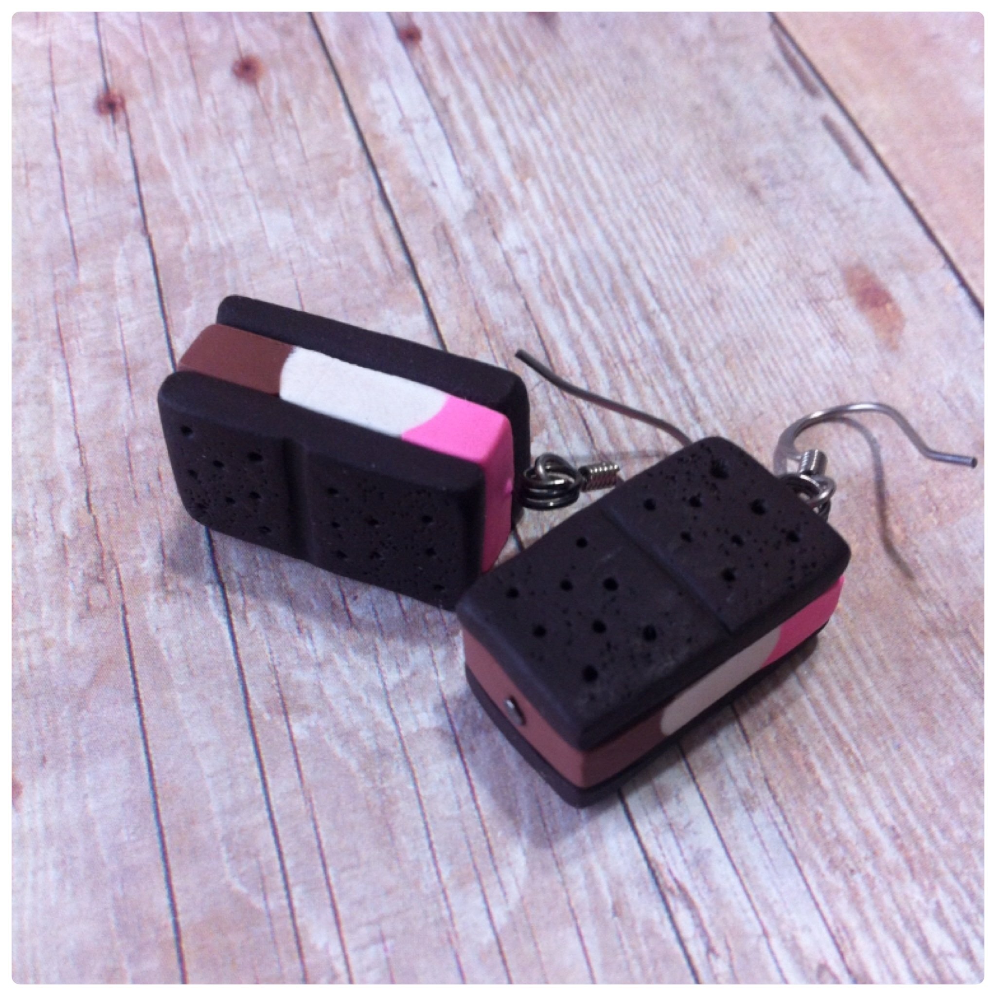 These cute and yummy looking dangles I made 100% by hand, using polymer clay. A pair of realistic mini old fashioned Neapolitan flavored (strawberry, vanilla and chocolate) ice cream sandwich. Great for everyday wear!