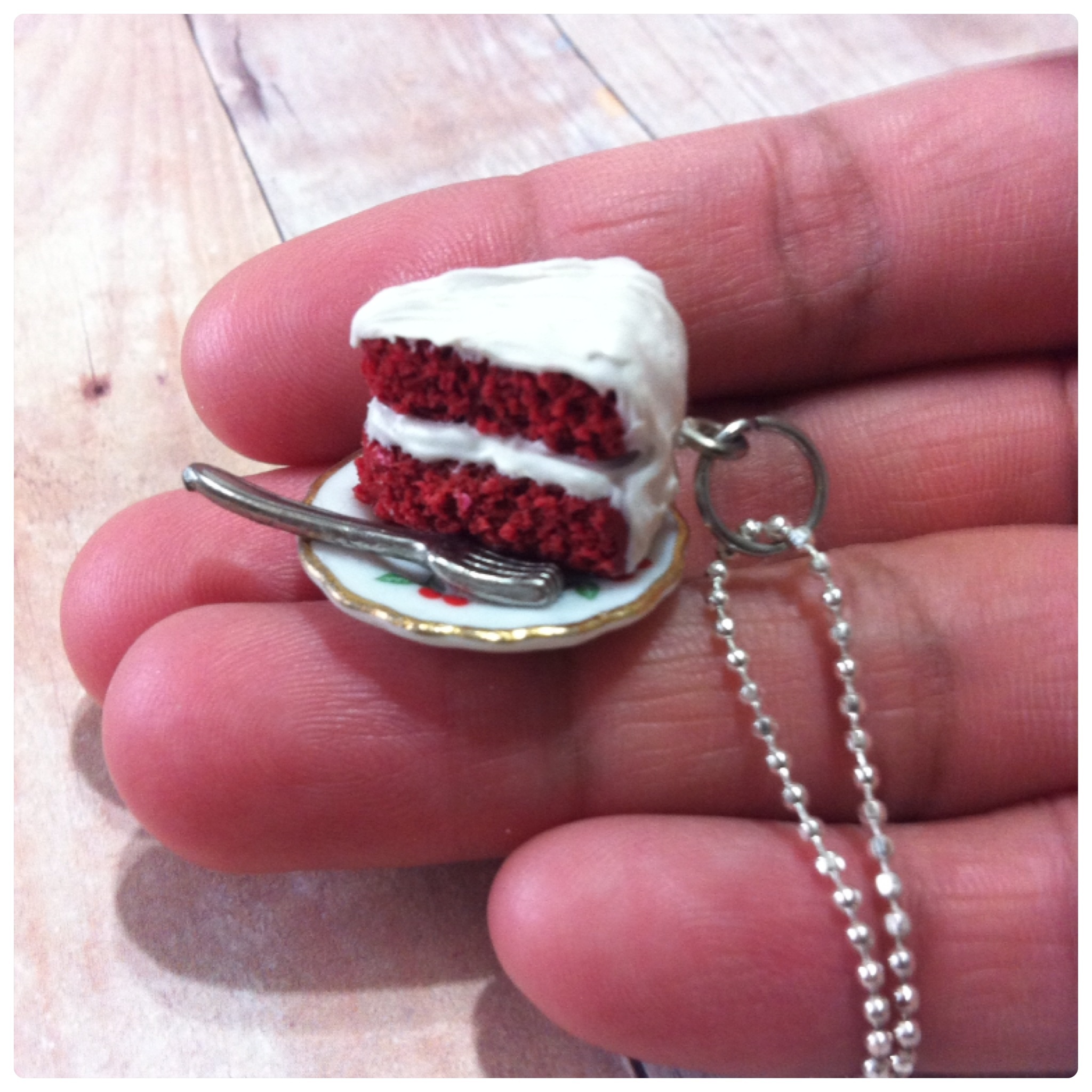 This adorable Red Velvet Cake sits on a plate with a fork on the side. This piece was made out of polymer clay combined with miniature kitchen accessories. The silver plated dainty ball chain measures 18". Perfect for cake lovers!